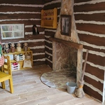 Chimney wall and pantry shelf in the Chardon house. Dollhouse constructed of foam core board, chipboard, and recycled materials. The chimney stones are made from egg carton.